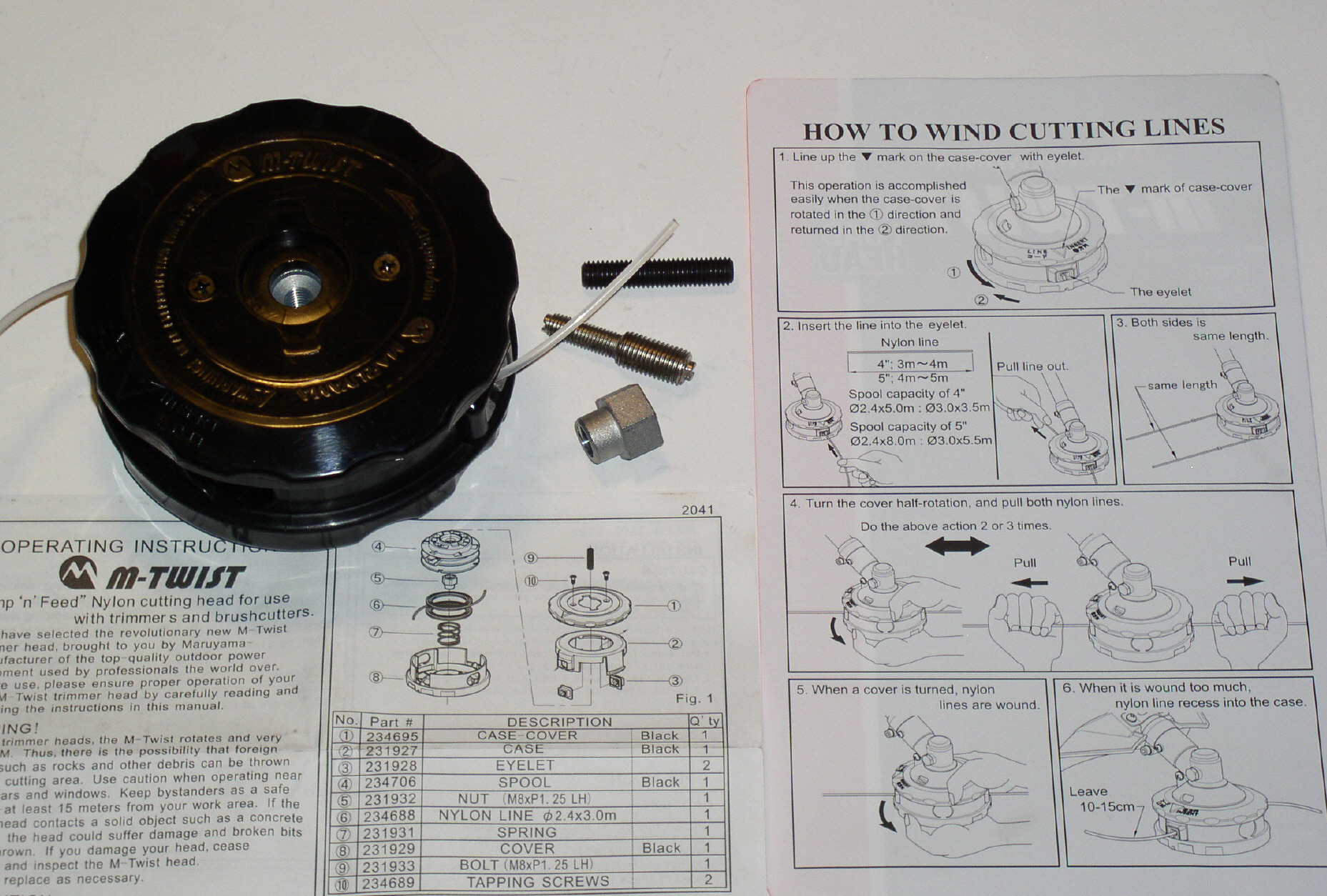 Der M-Twist 4 Zoll ist mit einer Mutter im Fadenkopf ausgestattet (M8 x 1,25 Linksgewinde). Mitgeliefert werden 3 Adapter, die optional - je nach Anschluß an Ihrer Sense - verwendet werden können: Mutter M10 x 1,25 Linksgewinde, Bolzen M8 x 1,25 Linksgewinde, "Reduzier"-Bolzen M10 x 1,25 auf M7 x 1,0 (alles Linksgewinde). Dieser Fadenkopf passt daher an Motorsensen mit einer Schraube (M8 oder M10) oder Mutter (M7 oder M8) am Winkelgetriebe für die Fadenkopfaufnahme (mit entspr. Steigung und Linksgewinde, wie angegeben). Bitte achten Sie auf den Anschluss/Aufnahme an Ihrer Motorsense.