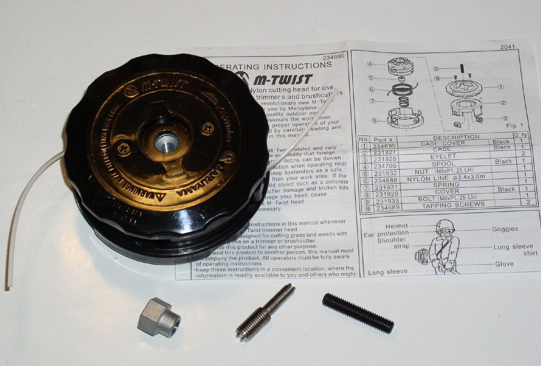 - halbautomatischer Fadenkopf 4 Zoll M-Twist mit weiblicher Aufnahme Mutter M8 Linksgewinde (bereits montiert im Kopf). Inkl. Adaptermutter weiblich M10, Adapterbolzen M8, Adapterbolzen M10 auf M7 (alles Linksgewinde)