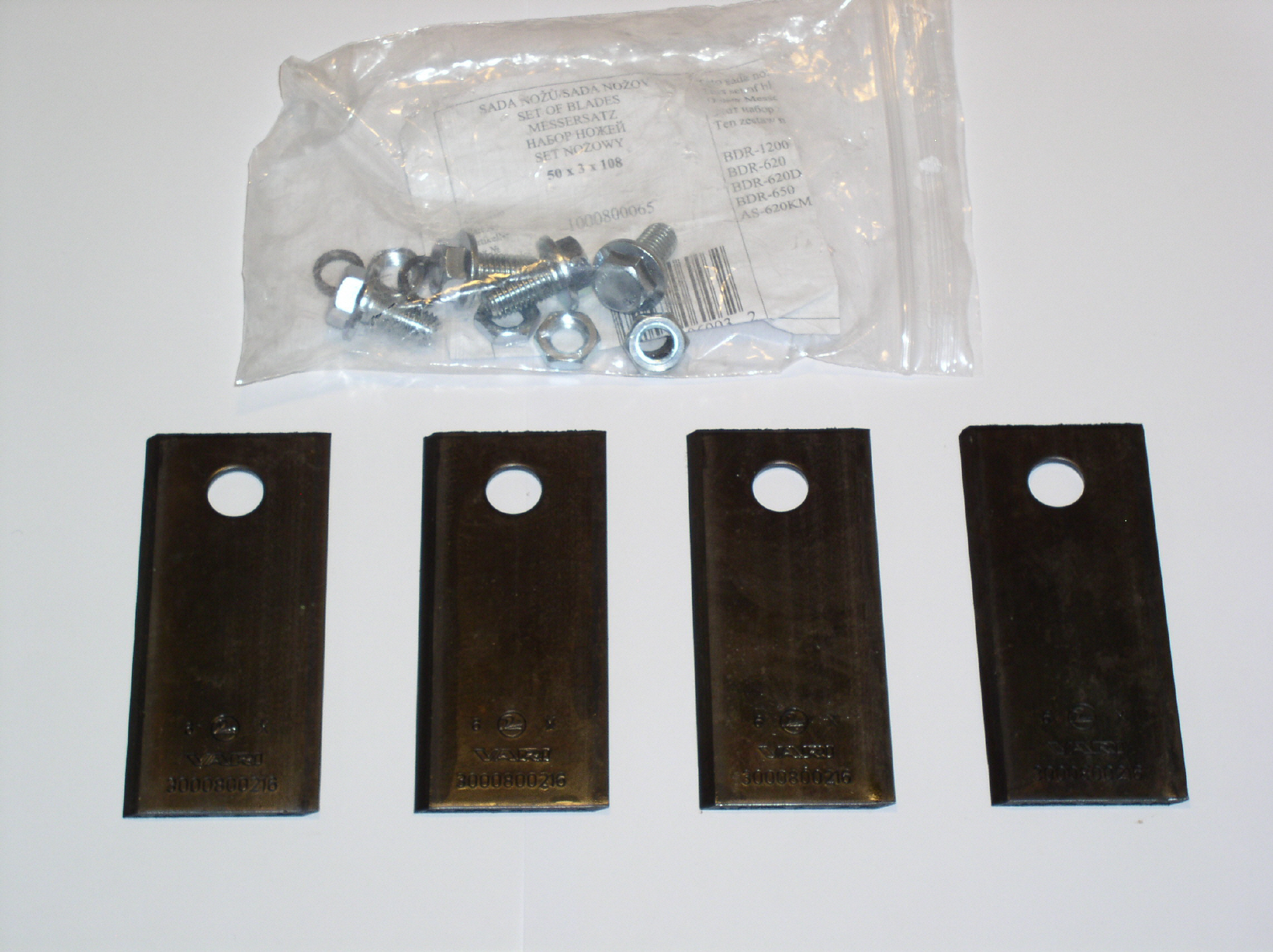 Rasenmäher-Messerklingensatz 108 mm - Loch-Ø: 14,2 mm - Klingenlänge: 108 mm - Messerbreite: 48 mm - Messerstärke: 3 mm - inkl. 4 Schrauben, Muttern u. Buchsen - passend für Typen: BDR-1200, BDR-620, BDR-620D, BDR-650, AS-Motor: AS-620 KM