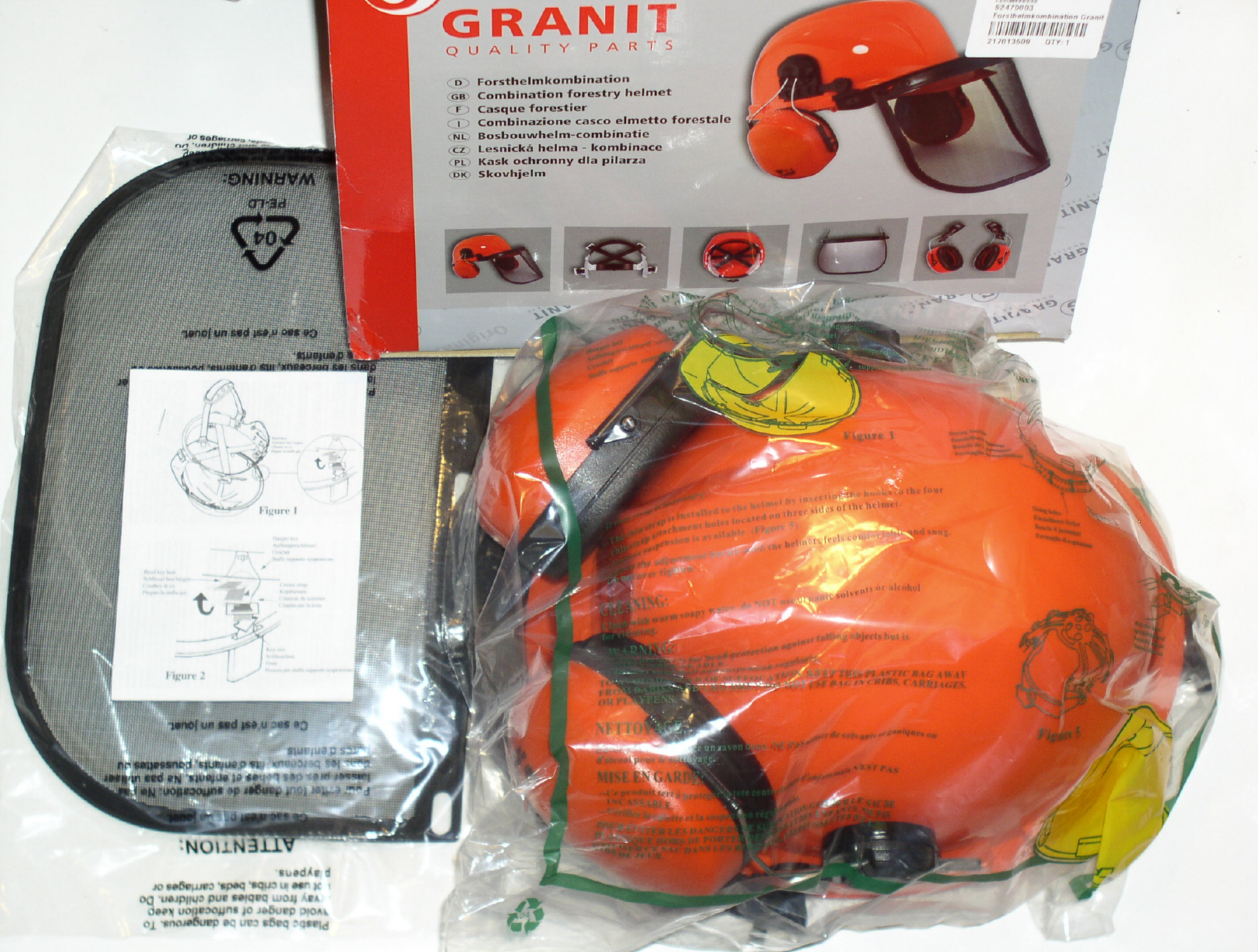 Lieferumfang: Schutzhelm, Gehörschutz (praktisch am Helm befestigt) und Gesichtsschutz