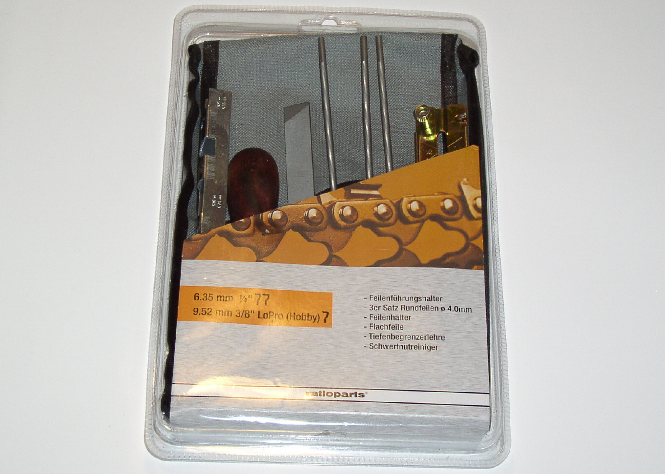 Lieferumfang: 3 x Rundfeile Ø 4 mm, 1 x Flachfeile, 1 x Feilenhalter, 1 x Feilenführungshalter, 1 x Tiefenbegrenzerlehre mit Schwertnutreiniger
