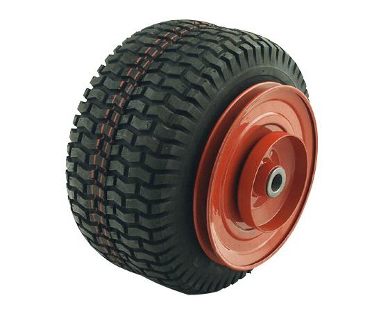 - schlauchloser Reifen mit Turfprofil, kpl. mit Felge, Felge ist ausgerüstet mit Antriebsscheibe für Keilriemen und Bremstrommel, Farbe: rot, Reifengröße: 13 x 6.50-6