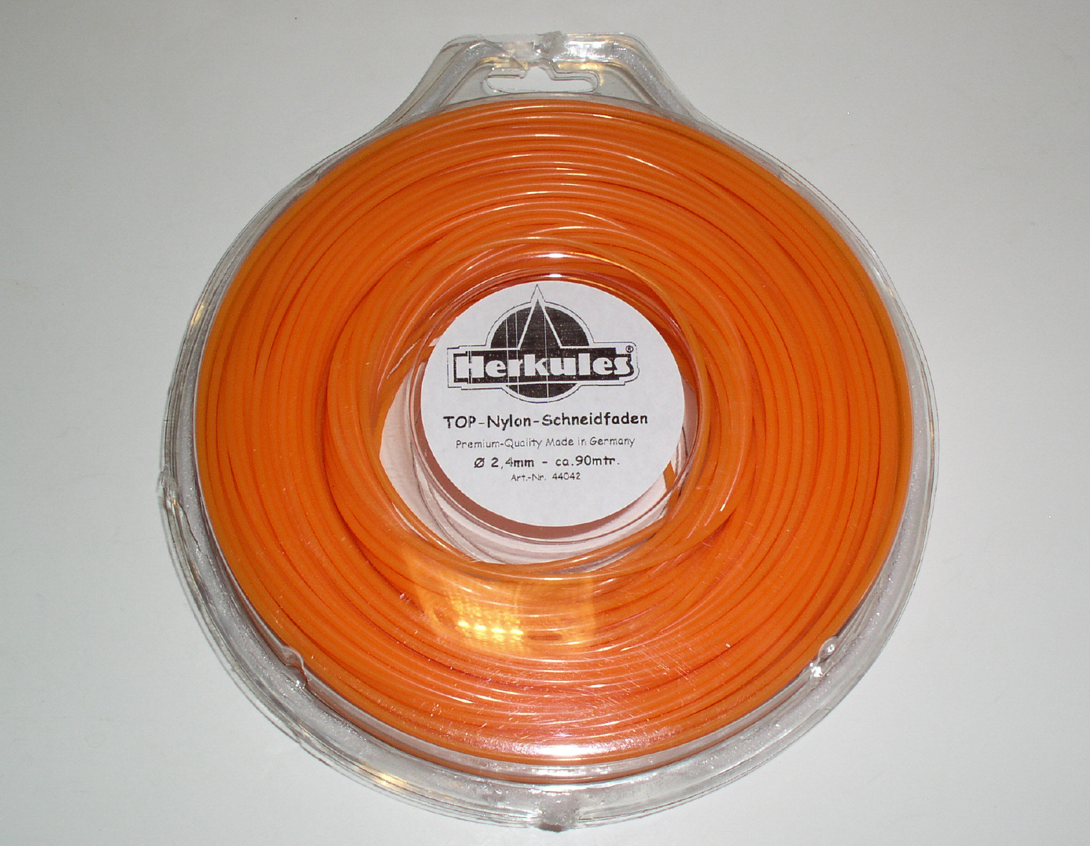 Nylon-Schneidfaden - von Herkules - Premium-Quality Made in Germany - Faden-Profil: rund - Faden-Durchmesser: 2,4 mm - Farbe: orange, Faden-Länge ca.: 90 m - für Rasentrimmer, Motorsensen u. Freischneider