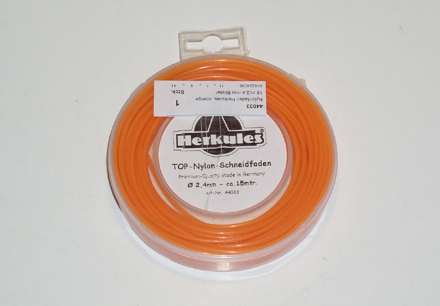 Nylon-Schneidfaden, Blister - von Herkules - Premium-Quality Made in Germany - Faden-Profil: rund - Faden-Durchmesser: 2,4 mm - Farbe: orange, Fadenlänge ca.: 15 m - für Rasentrimmer, Motorsensen u. Freischneider